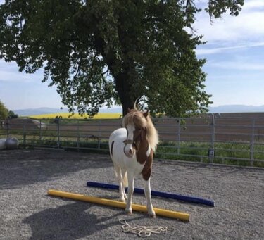 Fressständer, eigenes Heu und Stroh, 4-5 Mahlzeiten, gedeckter Sattelplatz, beleuchteter Reitplatz 20x20m, Weiden und noch vieles mehr!