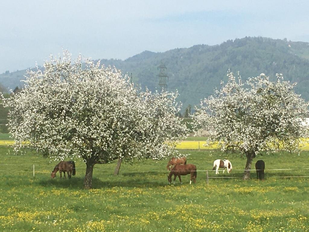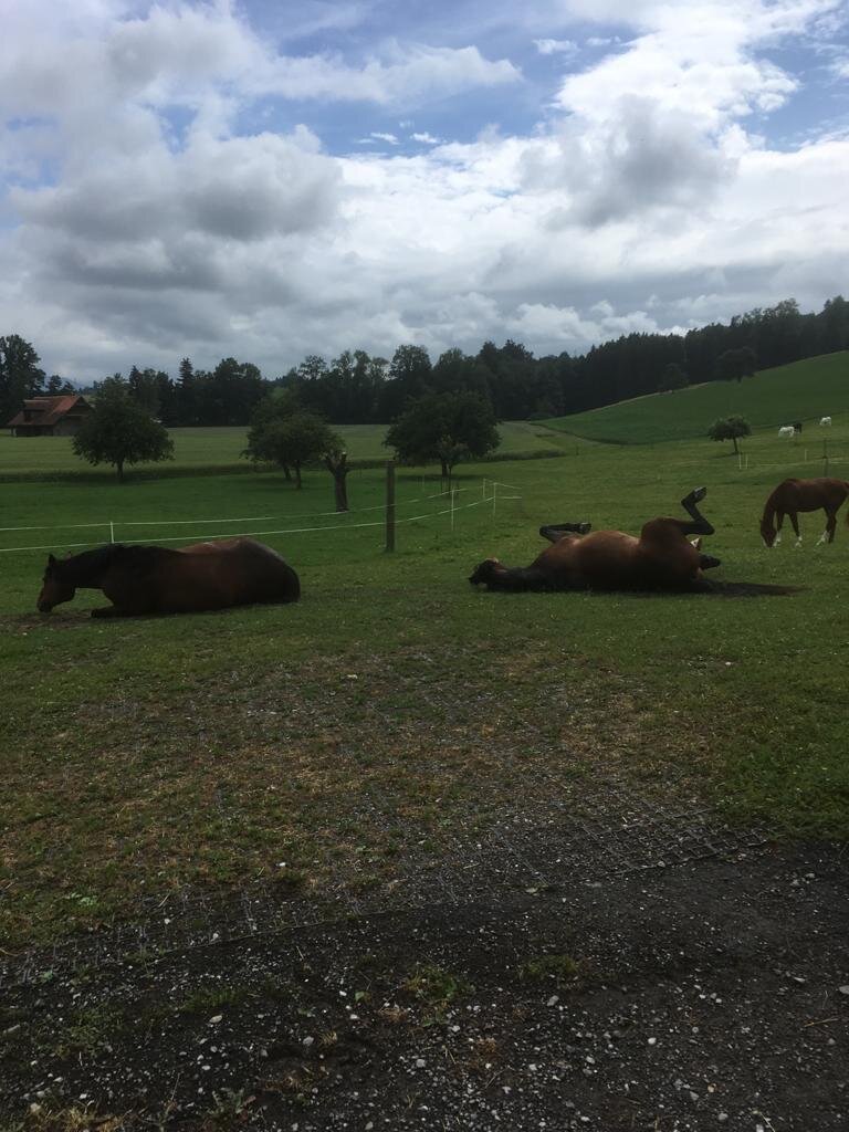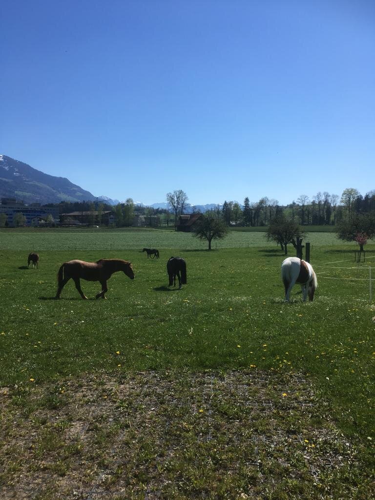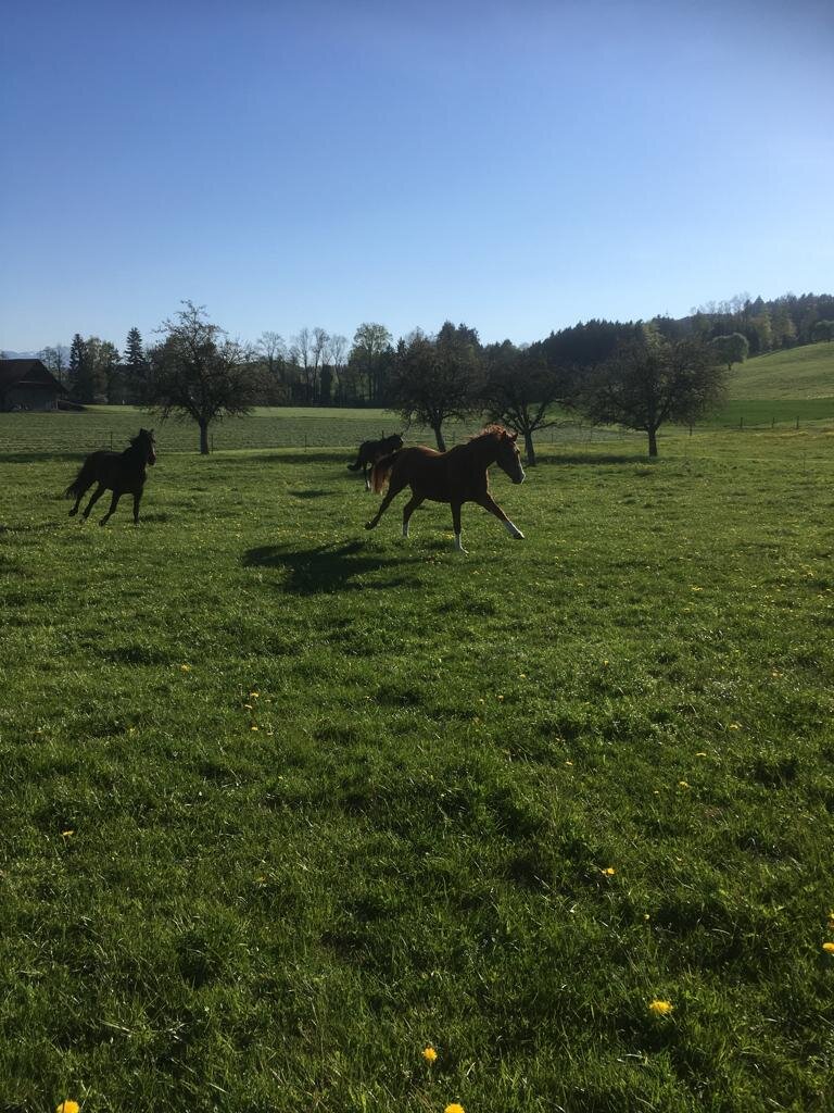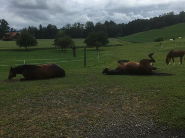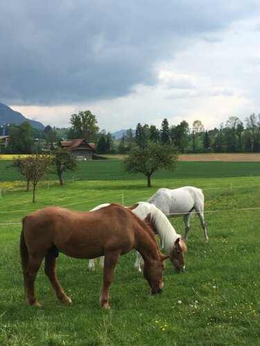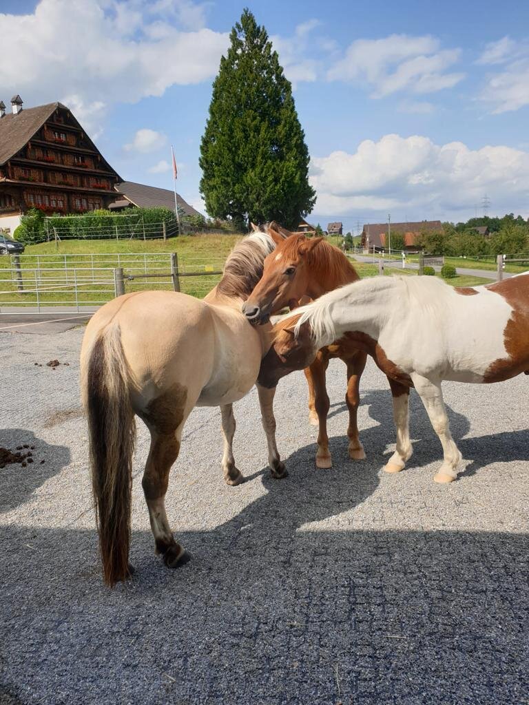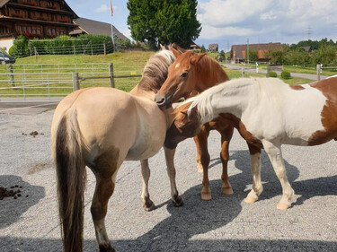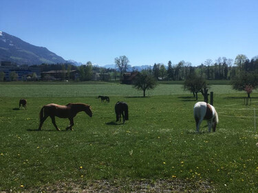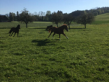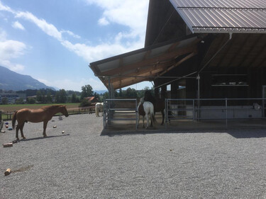 Auf unserem Familienbetrieb bieten wir im neu umgebauten Stall 2 x 5 Pferdepensionsplätze in Vollpension an. Bei Bedarf können auch kleinere Gruppen oder Einzelboxen eingerichtet werden. Im Gruppenstall ist die Liegefläche von der Auslauffläche frei begehbar ohne Sackgassen und Engstellen. Die Liegefläche besteht aus Komfortliegematten mit zusätzlicher Einstreu. Zur Fütterung kann der Stall in 5 Einzelboxen unterteilt werden, wo die Tiere 2 - 3 mal täglich auf das Einzeltier abgestimmte Fütterung erhalten.So kann jedes Pferd stressfrei sein Futter zu sich nehmen.Die Heuportionen werden jedes Mal abgewogen. Der Besitzer des Pferdes entscheidet wie viel Futter wir seinem Pferd füttern sollen.Wir Füttern ausschliesslich Heu von guter pferdegerechter Qualität. Es besteht auch die Möglichkeit sein eigenes Futter mitzubringen welches wir dem Pferd verabreichen sollen.Während der Vegetationsperiode steht den Pferden direkt angrenzend an den Stall eine grössere Weideflächen zur Verfügung. Je nach Bedarf können wir die Pferde in der Gruppe oder Einzel auf die Weide lassen.Zusätzlich stehen neu auch grosszügige Auslaufboxen zur Verfügung. Die Boxen von 16 m2 Grösse und zusätzlich ständig begehbarem Auslauf bieten den Pferden grossen Komfort. Zusätzlich besteht auch die Möglichkeit die Boxen miteinander zu verbinden, damit daraus ein Mehrraumstall entsteht.Es steht ein grosszügiger überdachter Sattel- und Reinigungsplatz zur freien Verfügung. Für jeden Pensionsplatz steht ein grosser Sattelschrank zu Verfügung.Für das gemütliche Zwischendurch steht das gemütliche Hofcafé mit Hofladen zur Verfügung.Auf unserem Spielplatz dürfen sich unsere kleinen Gäste gerne austoben.Gleich angrenzend an den Stall befindet sich ein all Wetter Bewegungsplatz zur freien Verfügung. Bei Bedarf steht auf einem Partnerbetrieb in zirka 20 Minuten Reitdistanz ein Reitplatz zur Verfügung, der zusätzlich gebucht werden kann. Unser Stall befindet sich mitten in einem grossen natürlichen Reitgebiet. Es müssen keine stark befahrenen Strassen begangen werden. Reithallen sind in kurzer Zeit zu Fuss oder mit dem Auto erreichbar. Es besteht die Möglichkeit auf Wunsch einen Anhängerplatz beim Stall zu mieten. Gute Tierbetreuung ist uns sehr wichtig. Bei uns auf dem Hof ist fast immer jemand präsent um die Tiere auf dem Hof auf hohem Niveau zu betreuen. Bei Notfällen werden wir durch eine extra auf Pferde spezialisierte Tierklinik in unserer Nähe unterstützt.Transparent und familiär ist unser Motto. Jeder Besitzer bezahlt nur das was er bezieht für sein Pferd. Preis pro Pensionsplatz ab 500 Fr.Bei Interesse können wir Ihnen unverbindlich gerne weitere Auskünfte geben.