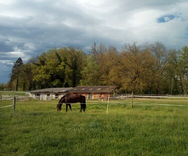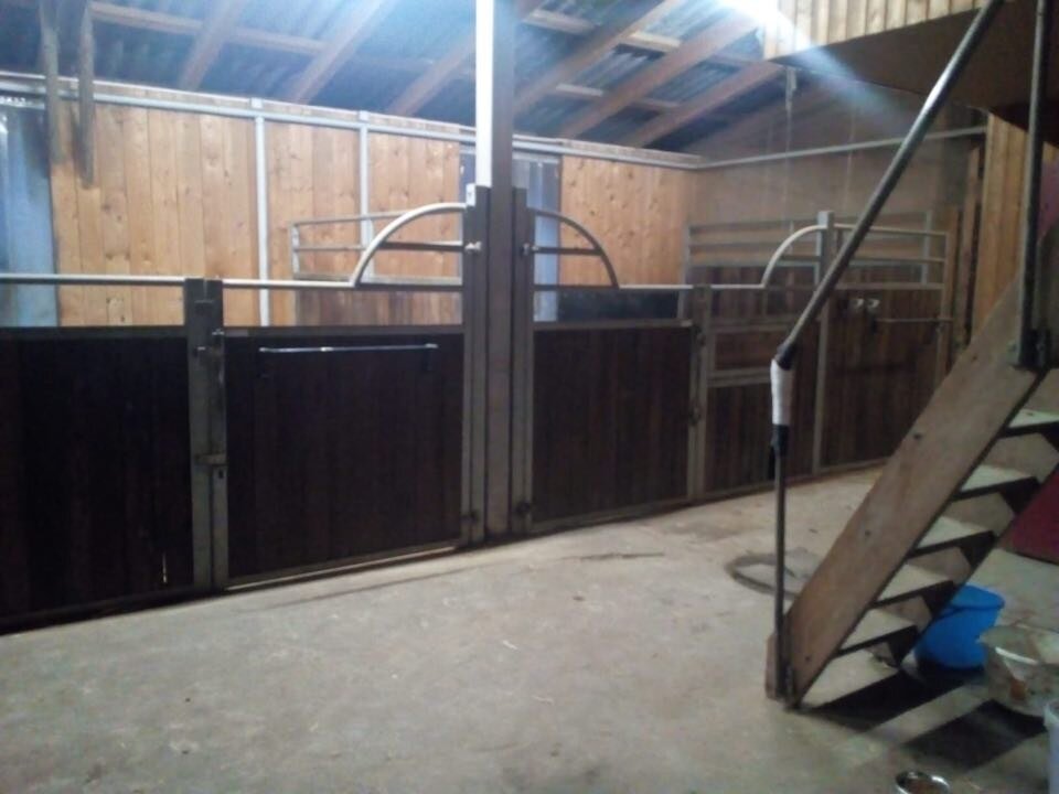 Unser Pferdestall bietet 6 Auslaufboxen, 4 davon mit direktem Weidezugang sowie einem 4er Gruppenstall. Tränkebecken sind beheizt, WC ist während der kalten Jahreszeit ökologisch via Restwärme von der Biogasanlage mit Abwärme geheizt, draussen haben wir eine kleine Sitzecke, Kühlschrank für Getränke ist während der warmen Jahreszeit eingeschaltet. 1 grosser Western-Sattelschrank pro Pferd. Separater Raum für Futtertonnen.
