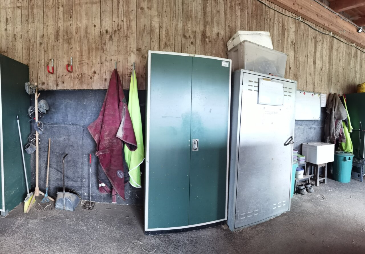 ‒ Sattelschränke vor der jeweiligen Box mit Hacken für Decken