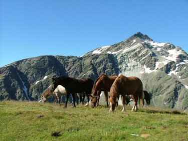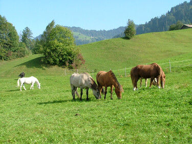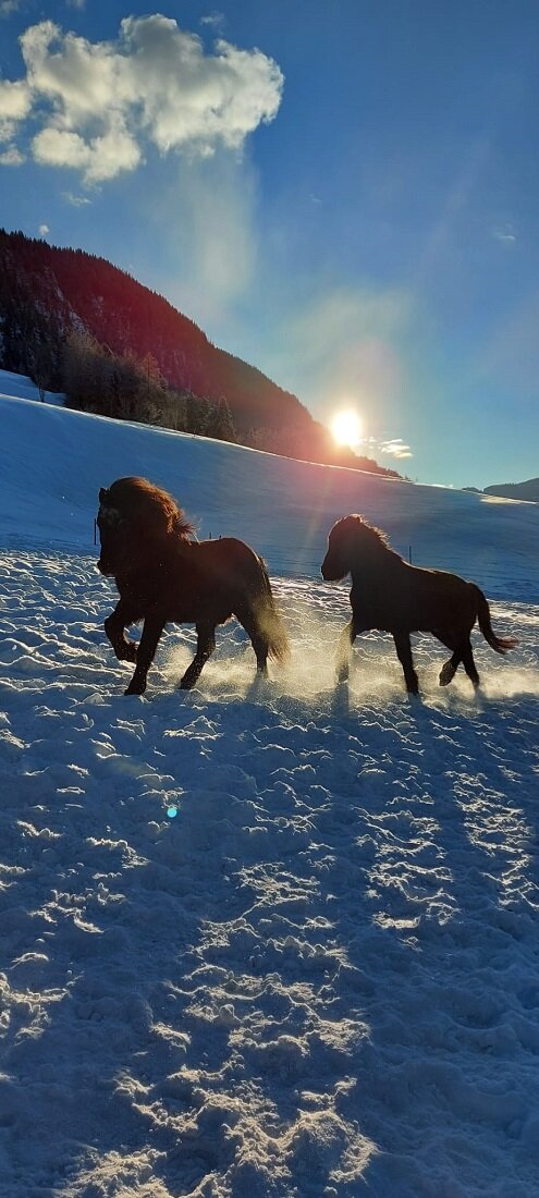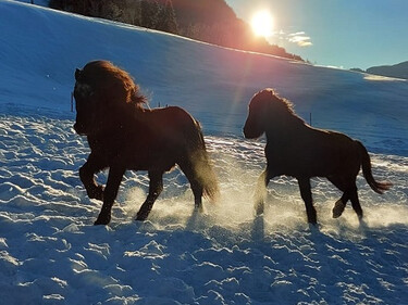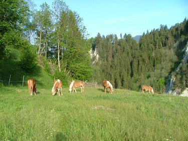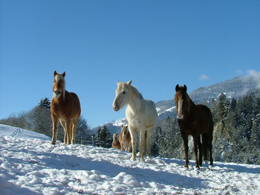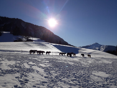 Von den Winter-und Sommerweiden immer freien Zugang zum Offenstall. Im Sommer dürfen die Pferde nach Absprache und gesundheitlichen Voraussetzungen den Sommer auf der Hochalp verbringen.