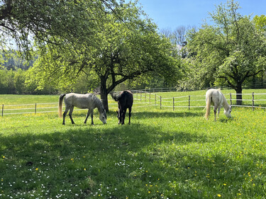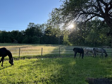 Die Pferde kommen täglich raus. Ob in meine Gruppe oder seperat kann besprochen werden. Weidegang, Fütterung, Pflege kann alles komplett individuell gemacht werden.