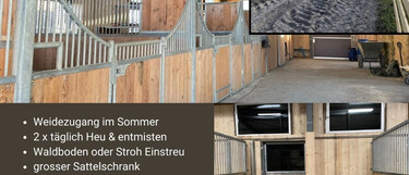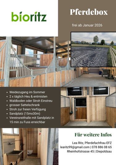 Pferdeboxen mit Herz – Jetzt freie Plätze verfügbar!Reithof Hazienda – 3504 NiederhünigenWir bieten komfortable Pferdeboxen in verschiedenen Grössen, mit oder ohne direkten Auslauf, eingebettet in eine wunderschöne Umgebung mit top Infrastruktur – ideal für Freizeit- und Sportpferde.Das erwartet dein Pferd bei uns:Unterschiedliche Boxengrössen, individuell auf dein Pferd abgestimmtMit oder ohne Auslauf buchbarTäglicher Weidegang oder Karussell – je nach WetterGummiböden & Strohpellets als Einstreu – gelenkschonend und hygienischHochwertige Fütterung mit Stroh, Heu, Kraftfutter – auch eigenes Futter möglichPreis pro Monat: CHF 750.– bis CHF 1'000.– (je nach Box und Leistungen)Unsere Infrastruktur – für Pferd & Reiter inklusive:Traumhaftes Reitgelände direkt vor der TürReitplatz 33 × 65 m, Karussell, Roundpen & grosszügige WeidenSattel- und Materialkammer, Anhängerparkplätze, Dusche & WCGemütliches Reiterstübli mit GarderobeProfessionelle Reitschule & aktiver ReitvereinBei uns wird Reitsport mit Herz und System gelebt:Offiziell anerkannter J+S-Betrieb (Jugend+Sport) Qualifizierter Unterricht für Kinder, Jugendliche & ErwachseneEigener Reitverein: J. & S. Reitverein HaziendaMitglied beim ZKV (Zentralschweizer Kavallerie- und Pferdesportverband)Genuss für Reiter, Besucher und GästeDirekt auf dem Gelände befindet sich unser gemütliches Restaurant, geführt von Michelle & Patrick.Beliebte Spezialitäten wie „Heisser Stein“ oder zartes Roastbeef machen den Besuch bei uns auch kulinarisch lohnenswert.Ideal für einen Zwischenhalt beim Ausreiten, nach dem Training – oder einfach für schöne Stunden im ländlichen Ambiente.Mehr Eindrücke gefällig?Schau rein auf:www.hazienda-emmental.chFacebook: Reithof HaziendaKontakt & Besichtigung:reithof@hazienda-emmental.ch079 810 51 10Wir freuen uns, dich und dein Pferd kennenzulernen!– Dein Team HaziendaHaziendaweg 11, 3504 Niederhünigen