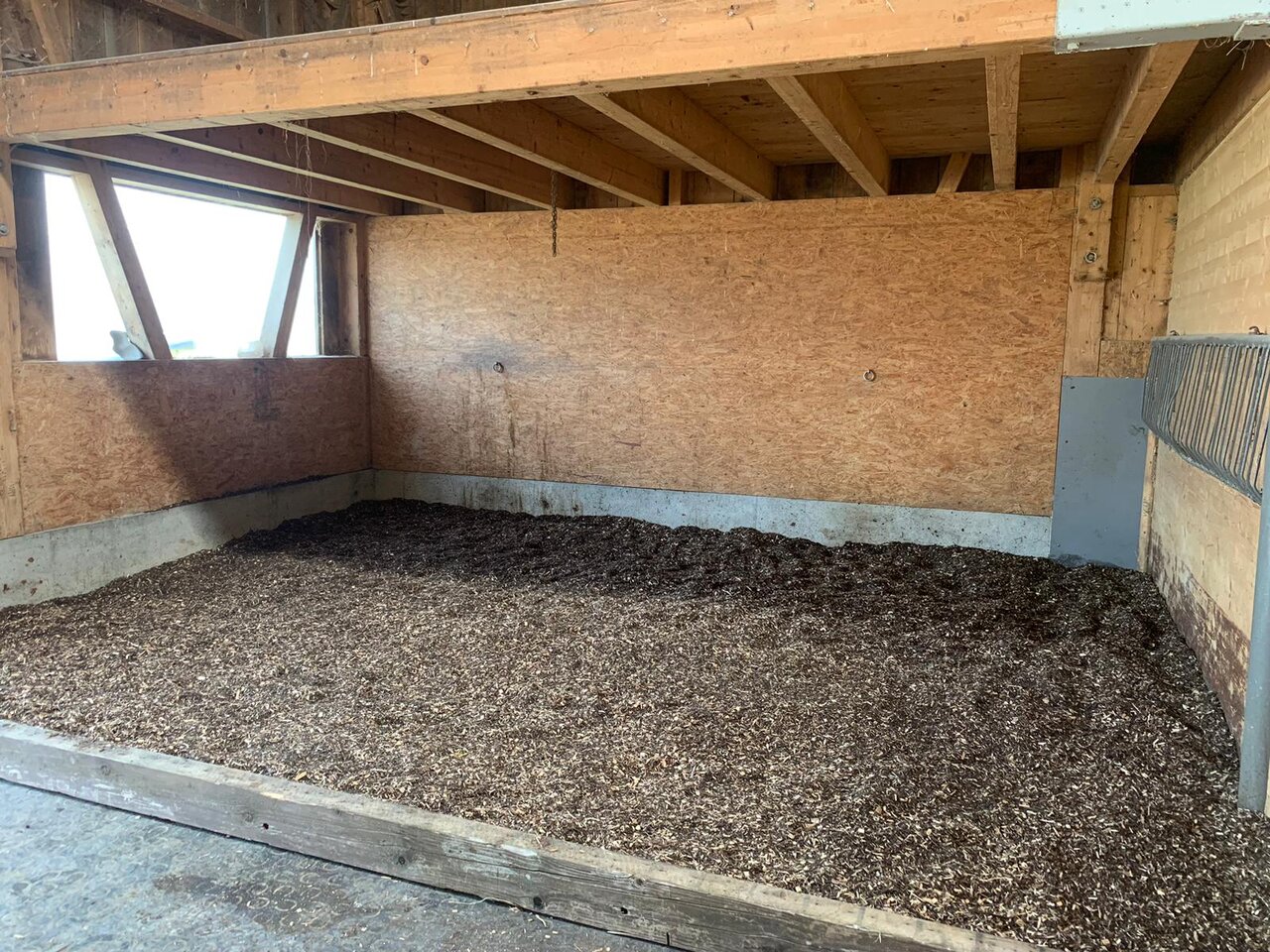 · Gedeckter Ruhe- und Liegebereich mit Waldboden und Gummimatten