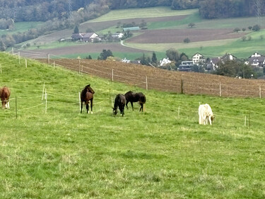 Die grossen Weiden grenzen direkt an den Stall. Wenn es die Witterung zulässt dauert unsere Weidesaison von März bis November. Wenn möglich weiden auch die Pferde in den Boxen in Gruppen.