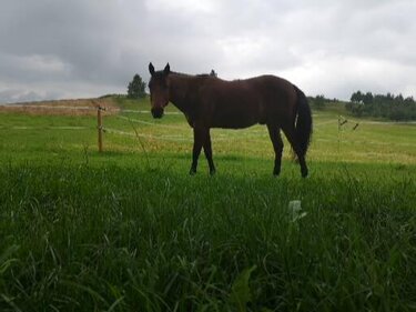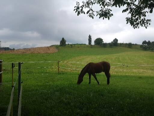 Wir kommen täglich auf die Weide und sonst haben wir einen Sandauslauf mit einem Trailweg. Gefüttert wird nicht 24h, aber wir bekommen 3-4 täglich genügend bedampftes Heu.
