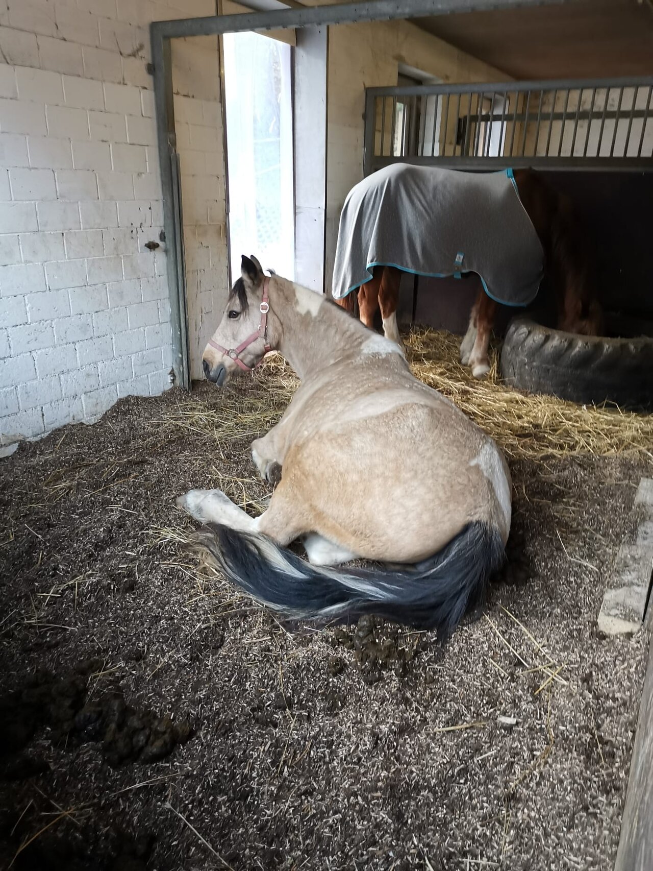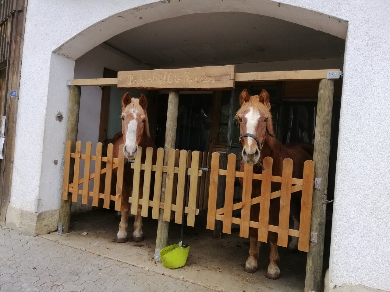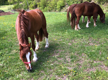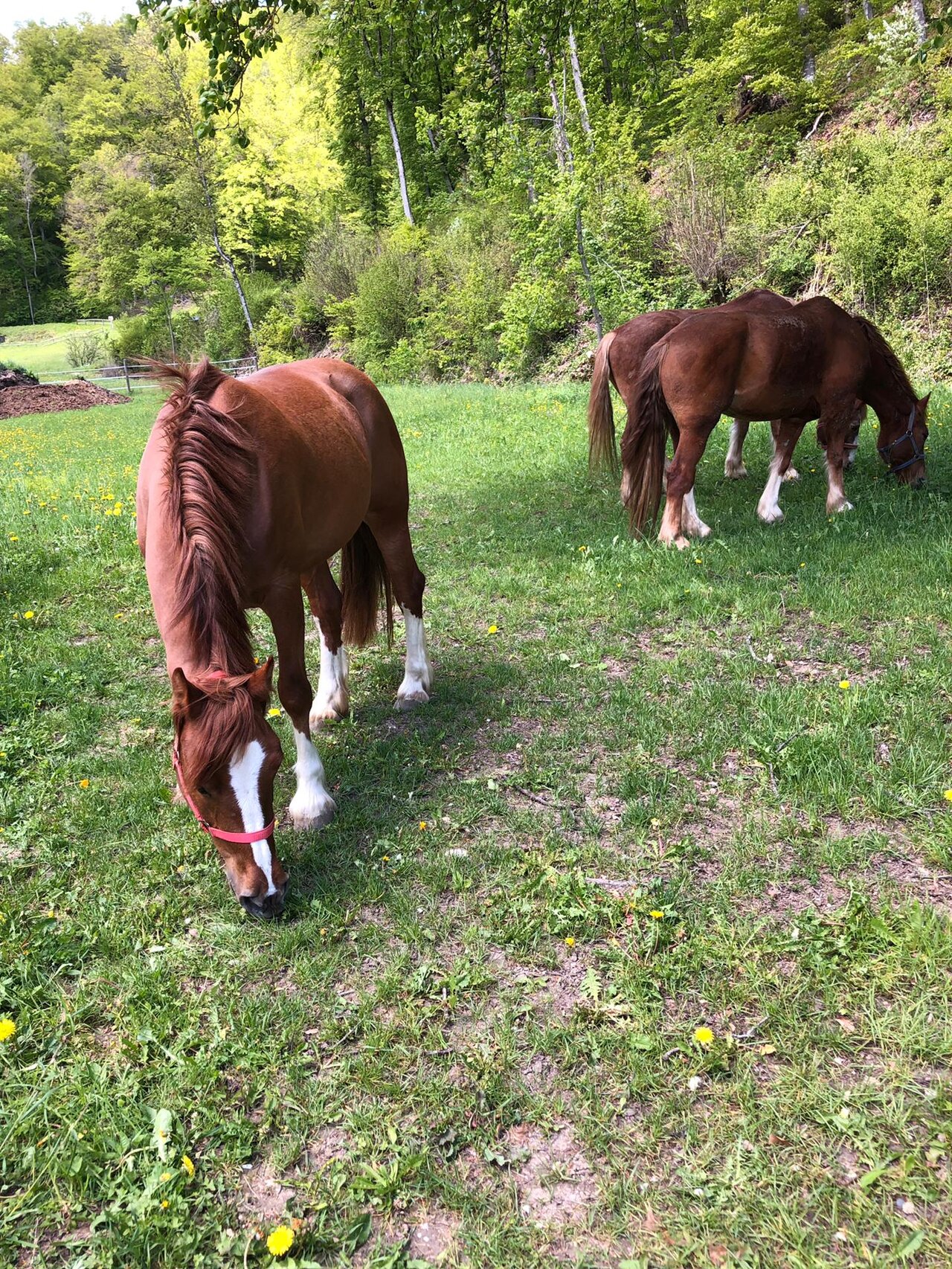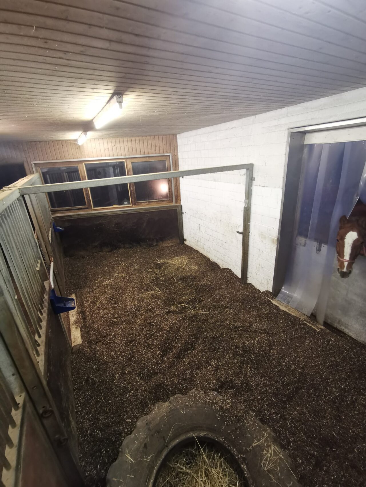 Eine Doppelbox mit stetigem Auslauf, 2x täglich ausmisten, Heufütterung mittels grosser Heuraufe, als Einstreu haben wir Bio-Waldboden, die Pferde dürfen das ganze Jahr über auf die Weide. Die Weide sind in unmittelbarer Nähe (1 Minute und 7 Minuten).