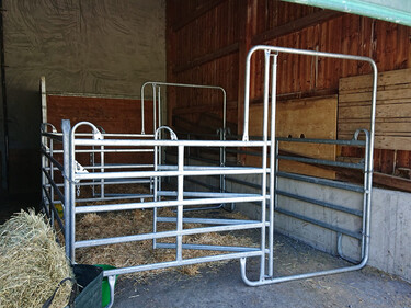 Kleiner und einfacher Stall mit tagsüber Gruppenhaltung und nachts seperate Auslaufboxen.