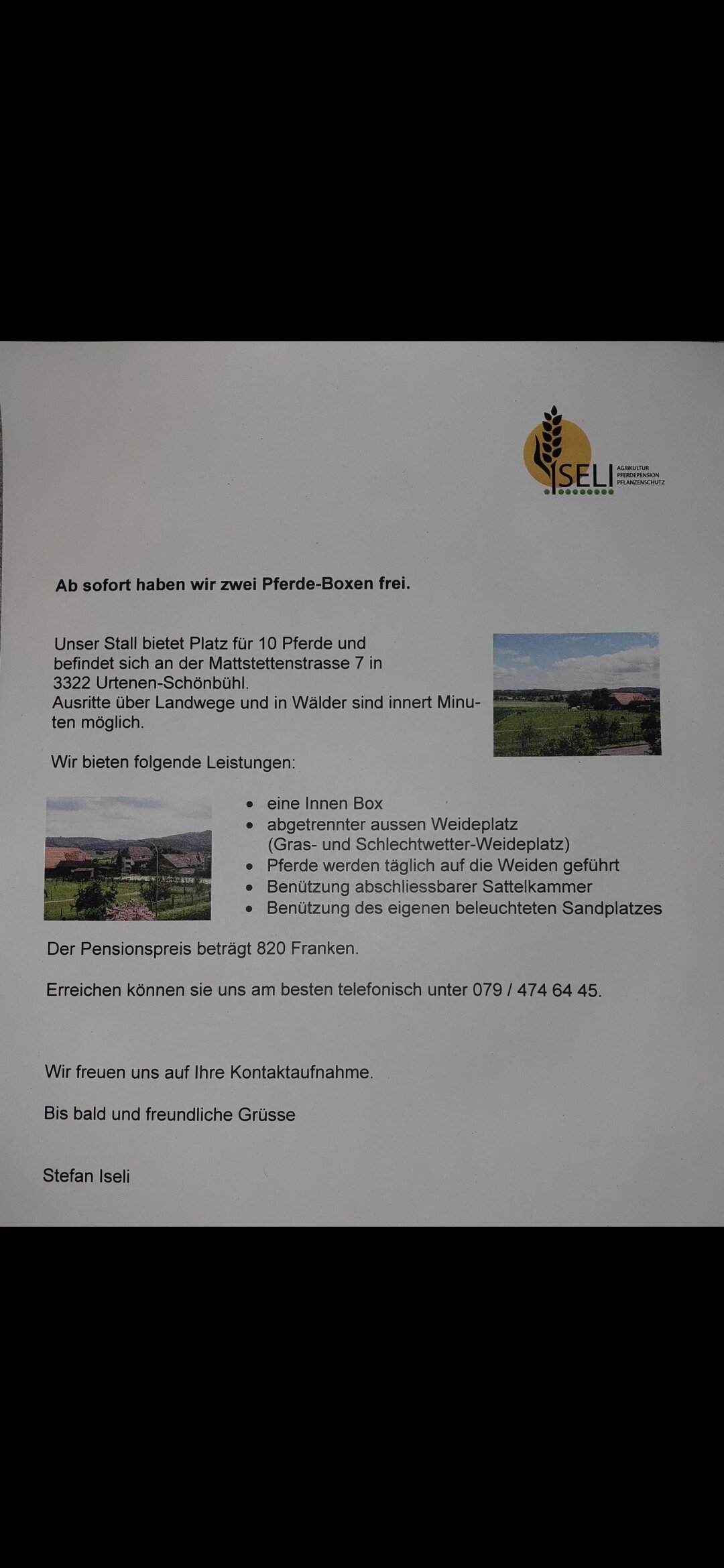Täglichä Weidegang vo ca. 7.00-17.00 (Summer dür d'Nacht). Individuelli Füetterig u Betreuig vo euchnä Rössli. Mir hei äs super usrittgebiet, äs vieregg u d'hauä vo Schönbühl isch i knapp 15min mitem Ross erreichbar, mitem outo keni 5 Minutä. Bi interässä chöit dir mir gärn ä Nachricht machä.