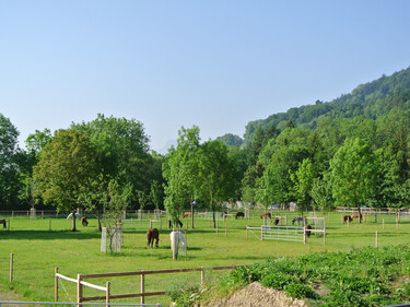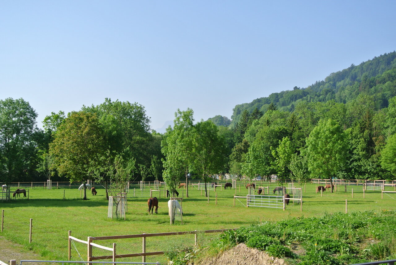 Täglicher Weidegang bei jeder Witterung ist garantiert. Ausserdem eine Reitschule