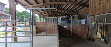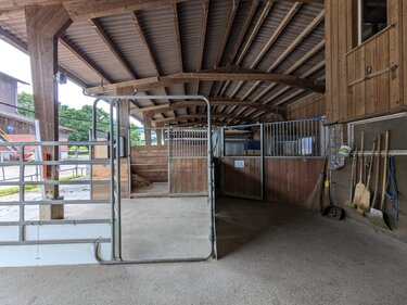 Einen grosszügigen 2er Offenstall mit zwei verbundenen Auslauf-Boxen mit viel Auslauf (87qm)