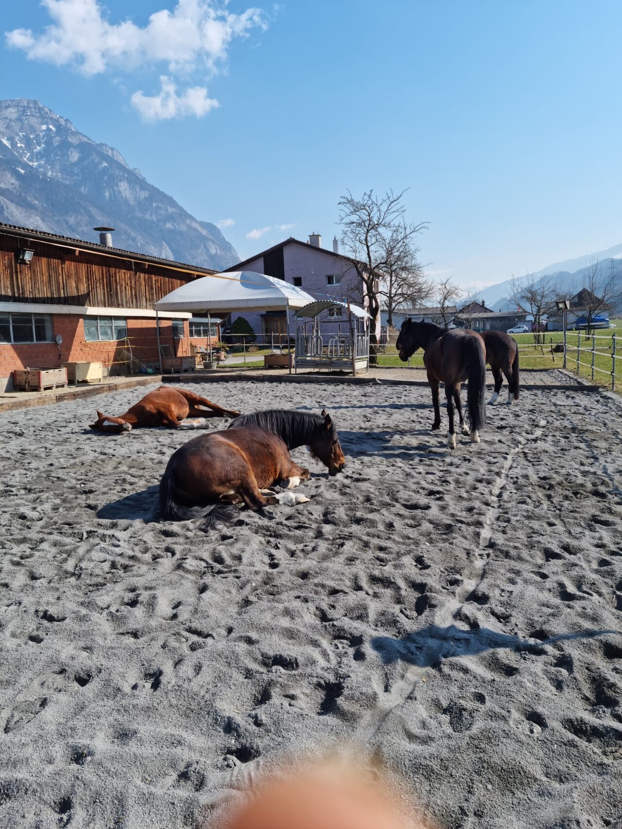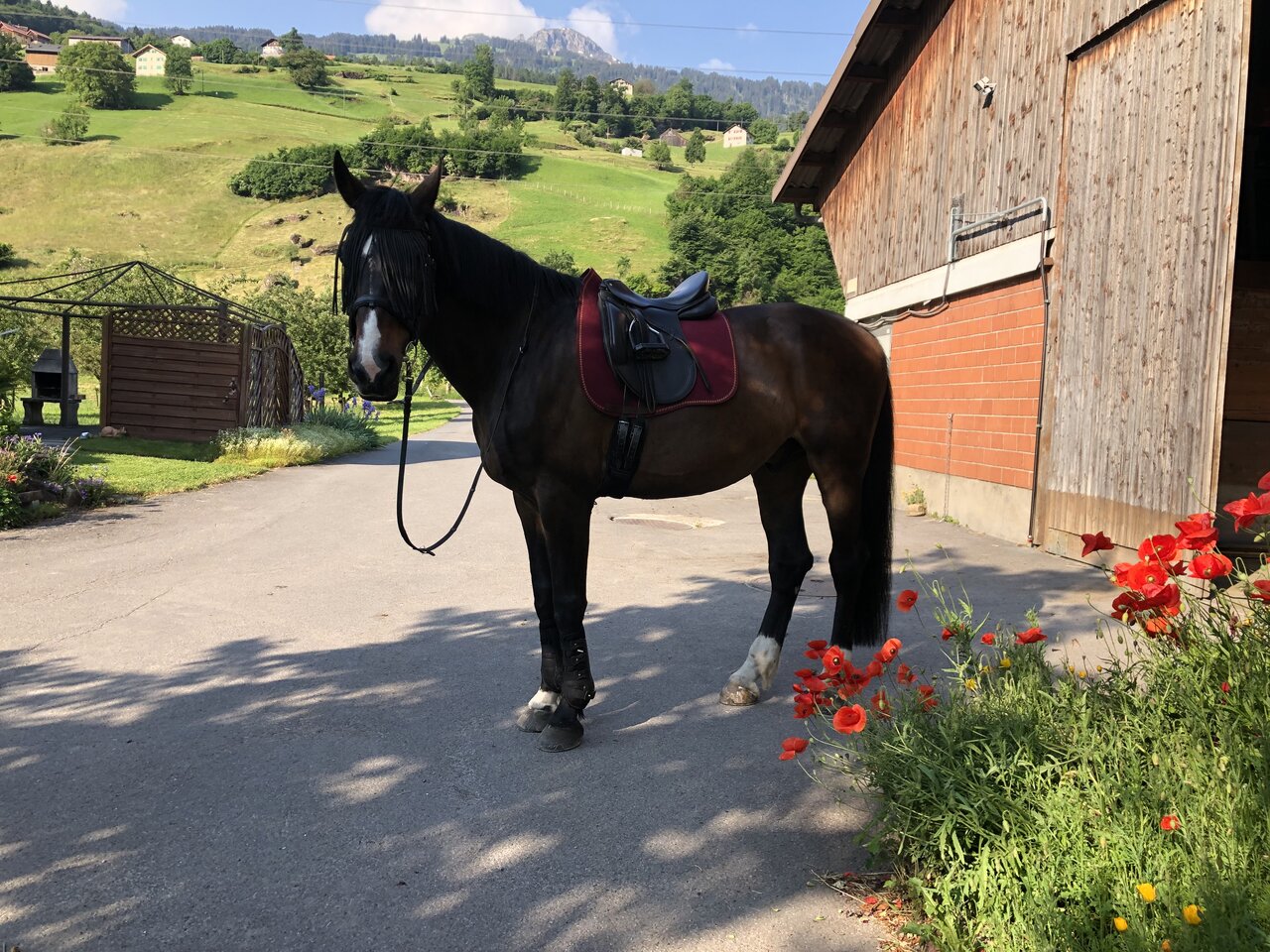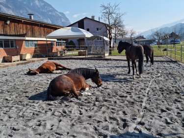 Am Tag Gruppenhaltung, im grossen Auslauf, mit gefüllten Futterplätzen und Schattenplätzen. Nachts Boxenruhe, für eine entspannte Nacht und angepasster Fütterung. Ebenfalls haben wir einen kleinen Sandplatz für Bodenarbeit, Reiterstübbli, eigener Sattelkasten, Weide, Abspritzplatz und ein überdeckten Sattelplatz. Gelände für schöne Ausritte, haben wir gleich vor der Stalltüre.☀️🐎
