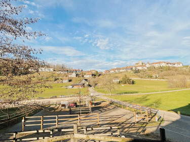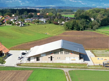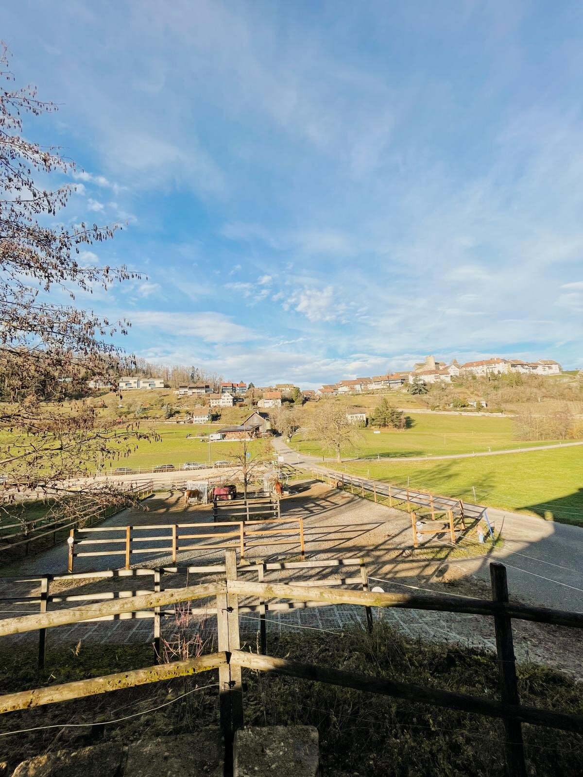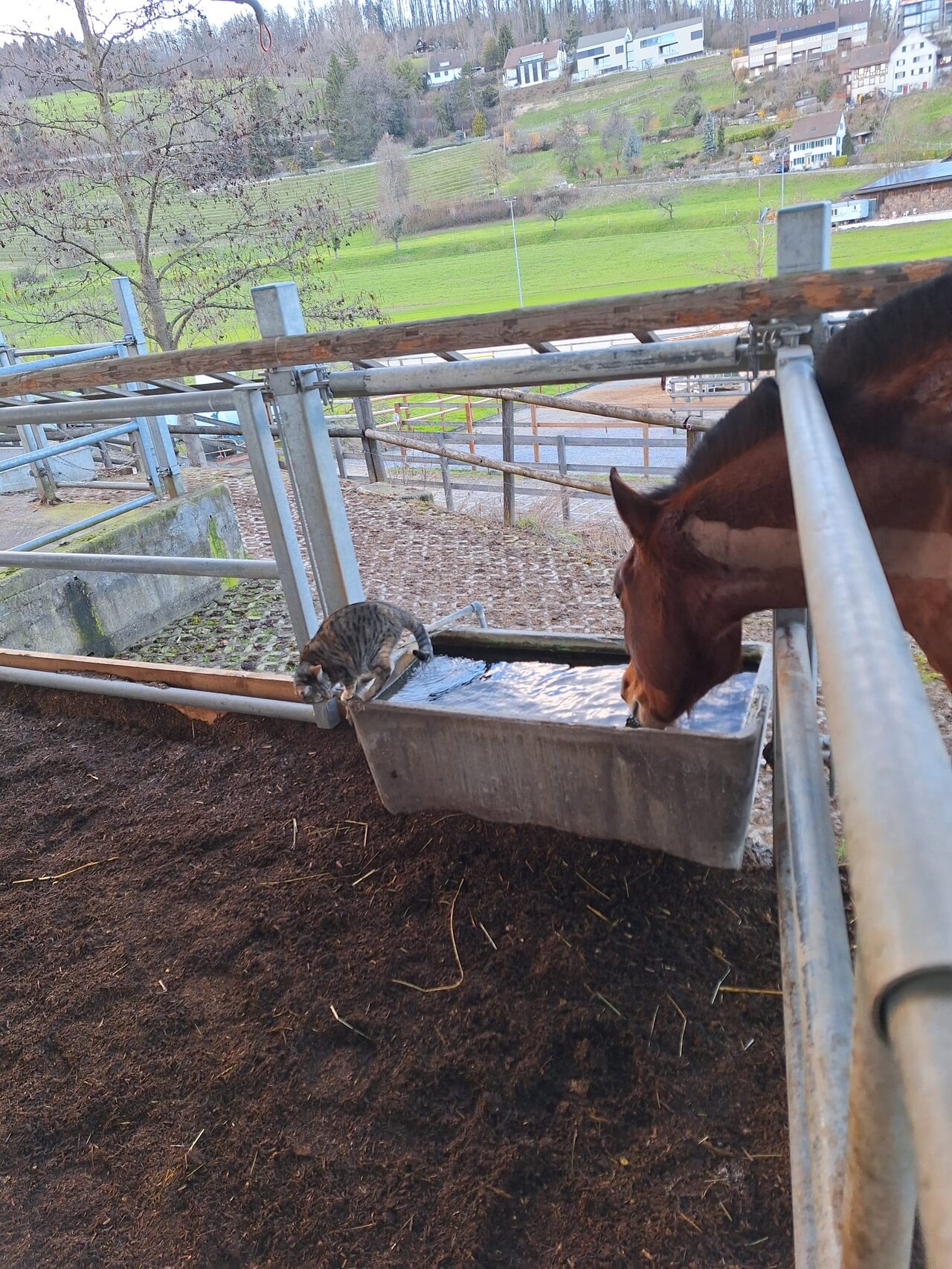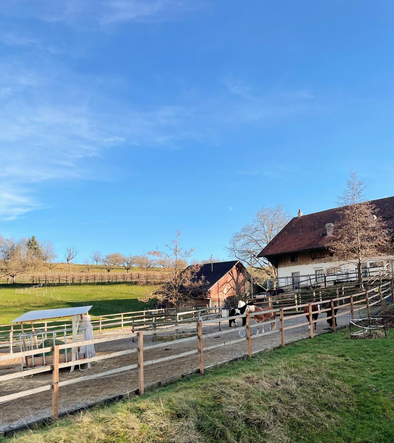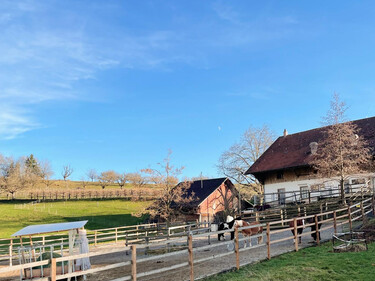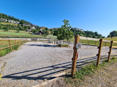 600m2 grosser Auslauf direkt unterhalb Stall, permanent zugänglich. Auslauffläche direkt beim Stall mit Gummimatten ausgelegt, daneben ein Hackschnitzel-Pissoir.