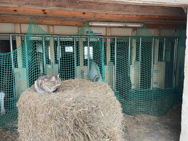 Heufütterung in Fressständen mit Fresspausen Während der Vegetationsperiode 3h täglich Weide in der Gruppe auf Wechselweiden, wenn witterungsbedingt möglich. Strohraufe im Auslauf
