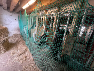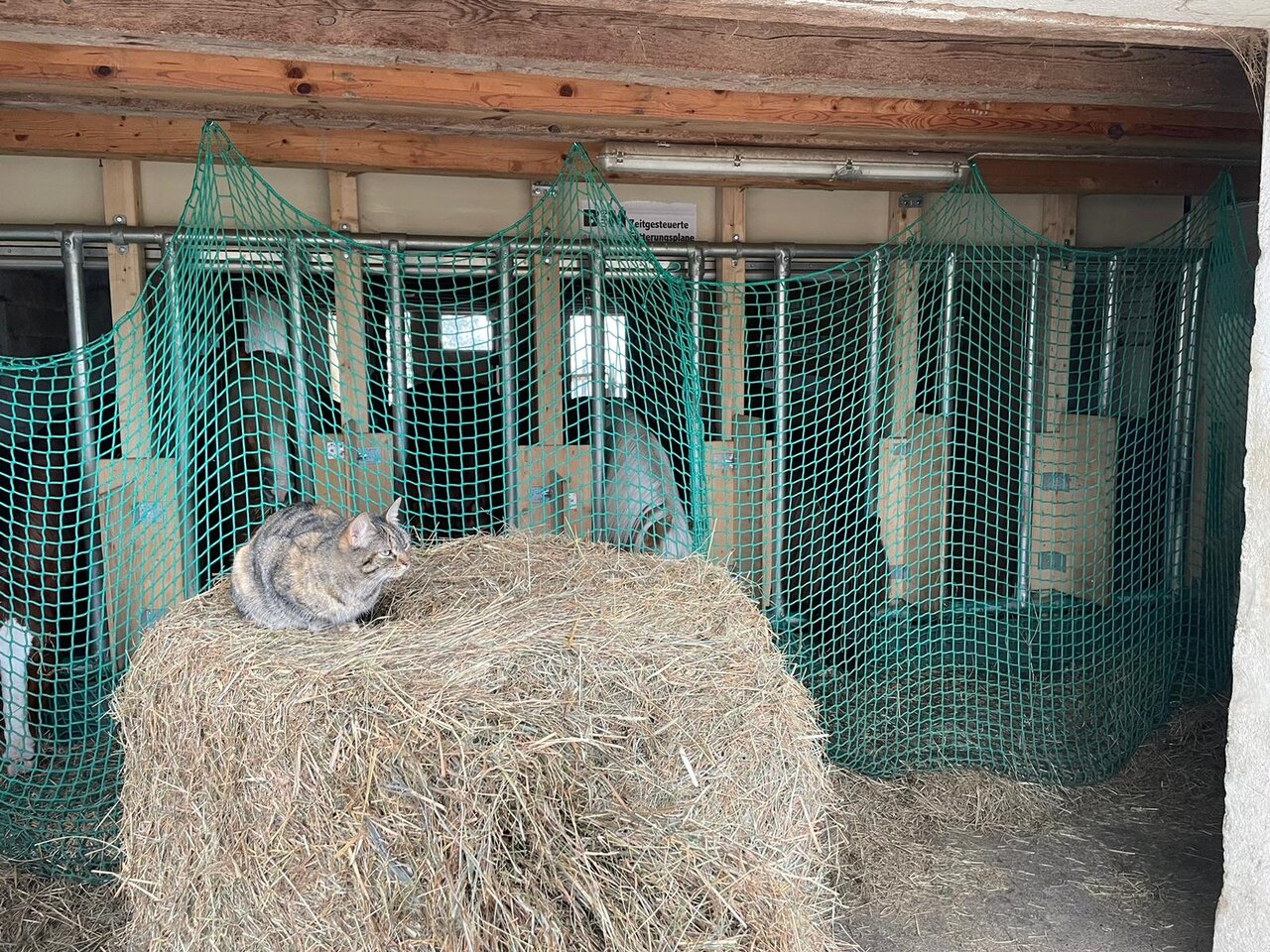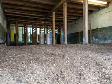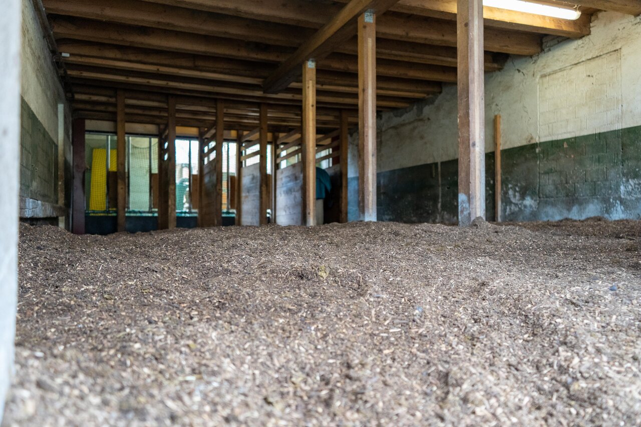 Mit Biowaldboden eingestreut. Die Liegefläche ist mit Sichtschützen unterteilt, dies sorgt für mehr Ruhe in der Gruppe. Es wird mindestens zweimal täglich ausgemistet, normalerweise dreimal täglich.