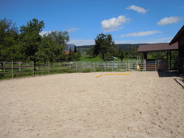 Ein neues Sandviereck (25 x 15 m) mit integrierter Bewässerung von unten und einer Tretschicht aus Quarzsand kann für Bodenarbeit, Longieren und zum Reiten genutzt werden.