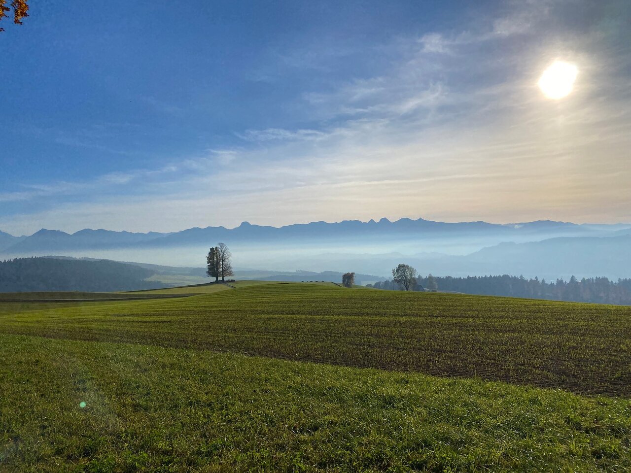 mit Steigungen führt am Waldrand entlang unter Bäumen und über Wiesen