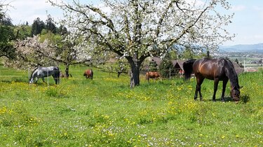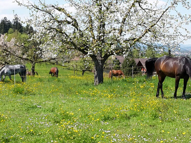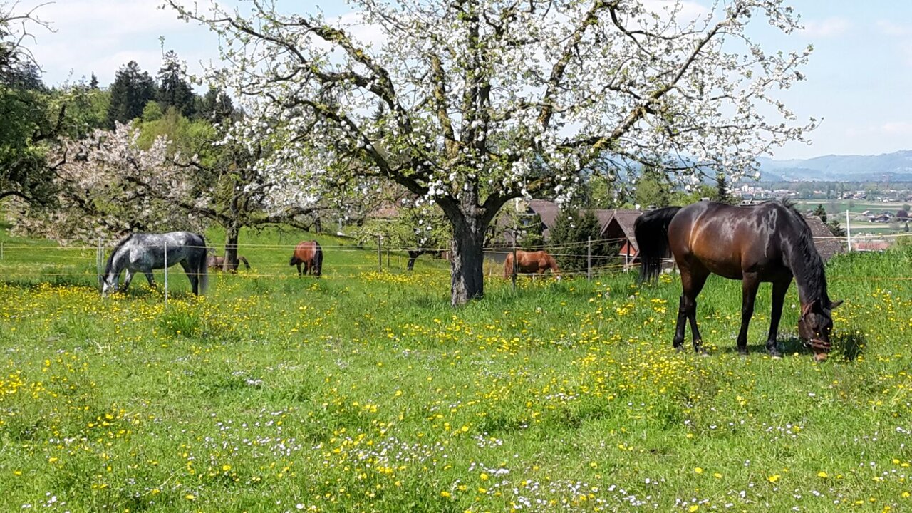 In unserem kleinen aber feinen Pensionsstall sind noch Boxen frei. Bei uns geniessen die Pferde dem Wetter angepassten Weidegang. Jedes Pferd hat seine eigene Weide. Auf Wunsch auch zu zweit oder in Gruppe möglich. Gefüttert und gemistet wird dreimal täglich. Raufutter (Heu aus eigener Produktion) und Kraftfutter, Menge nach Wunsch. Einstreu Stroh oder Späne. Zusätzlich ist der Decken- Fliegenmasken- und Glocken-/Gamaschenservice inklusive und selbstverständlich. Es steht ein Sandviereck zur Verfügung und ein wunderbares, weitläufiges Reitgebiet mit Wald und Feld.