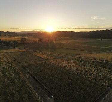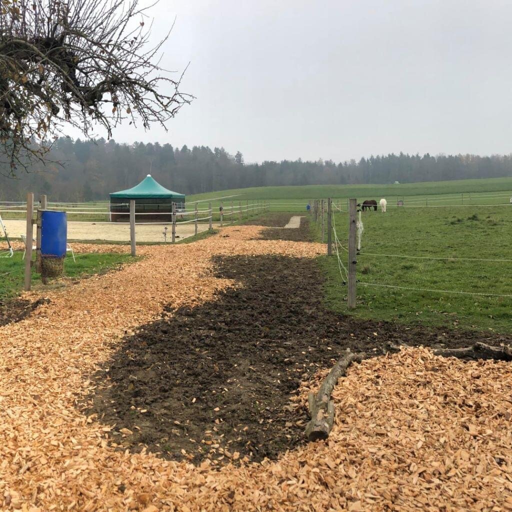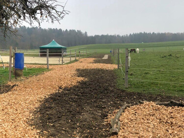 🐾Verschiedene Bodenbeläge; Auslauf - Rundkies, Trail - teils befestigt mit Lava, Holzschnitzel, teils Naturboden, Reitplatz - Quarzsand.