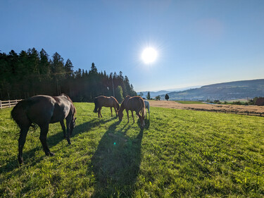 - Reitplatz 33 × 65 m, Karussell, Roundpen & grosszügige Weiden