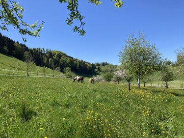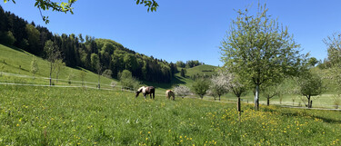 Inmitten der Moränenhügel von Menzingen in der Nähe der Sihl befindet sich auf der Greenhillranch unser kleiner Offenstall «Stall am Bächli»