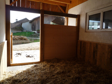 grosse Boxen, im gut durchlüfteten Stall, beheizte Selbstränken und staubarme Einstreu (Leinenstroh) bietet die Unterkunft, auf Wunsch ist Stroh als Einstreu möglich.