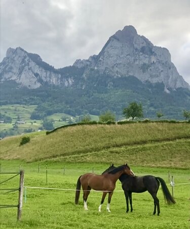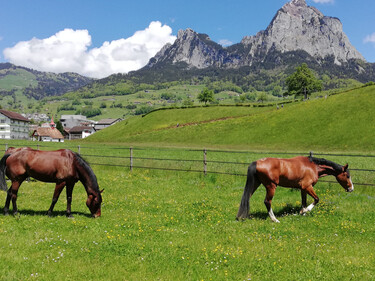 Willkommen auf unserem idyllisch gelegenen, ruhigen, familiären Pferdehof, wo sich alles um das Wohl der Pferde dreht. Bei uns findet ihr Pferd Erholung und Entspannung in schönen, ruhigen Auslaufboxen / grosse, gesicherte und mit Kamera austattbare Abfohlboxen / eine separate Hengstboxe mit sehr grossem Auslauf / zwei Offenställe für Kleingruppe (2-4 Pferde).Von unserem Stall aus reiten Sie direkt los ohne eine Strasse zu überqueren und können stundenlange Ausritte in einem wunderschönen, weitläufigen Reitgebiet geniessen. Was wir bieten:- grosse, helle Auslaufboxen mit Gummimatten / Einstreu Bio-Waldboden oder Stroh- Sommer-und Winterweide- Pferdeheu aus Eigenproduktion- 3 x täglich Kraftfutter (eigenes darf mitgebracht werden) und Heu- 2 x täglich Boxen misten sowie Bollen nehmen beim Mittagsstall- beleuchteter Reitplatz 20 x 40m mit Swing Ground (ganzes Jahr reitbar, gefriert nicht)- 2 Wasch-und Putzplätze- grosse Sattelkammern mit genügend Stauraum für Material (1 grosser Schrank, 2 Sattelhalter, 3-4 Zaumzeughalter pro Pensionär)- Reiterstübli mit Lavabo und WC- Anhängerparkplatz- Beritt / Betreuung der Pensionspferde bei Ferienabwesenheit- Reitunterricht / Hilfe bei PferdeausbildungRufen Sie uns an unter Tel. 079 955 76 72 um einen unverbindlichen Besichtigungstermin zu vereinbaren. Wir freuen uns auf Ihren Besuch.