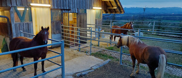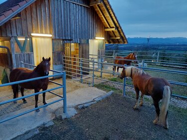 -Heu und Stroh soviel das Pferd benötigt. Kraftfutter nach Absprache -Täglicher Weidegang, oder in Gruppe auf Reitplatz -beheitzte Toilette/Garderobe und eigener Sattelschrank -Reitplatz beleuchtet -wunderschönes Reitgebiet, kein Autoverkehr