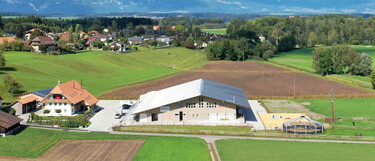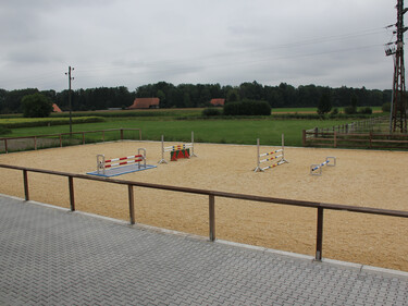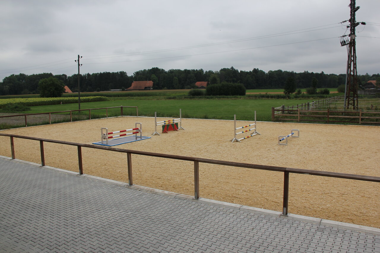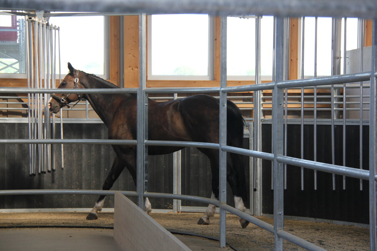 Ovalführanlage im Gebäude Reithalle 25 x 50 m mit top Hindernismaterial Aussenreitplatz 20 x 40 m Roundpen / Longierzirkel 14,5 m Sichere, saubere und grüne Weiden mit Holz- Elektrozaun.