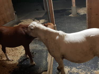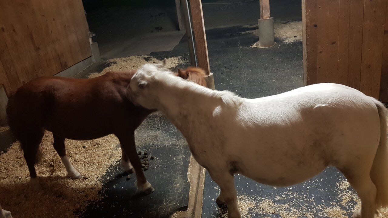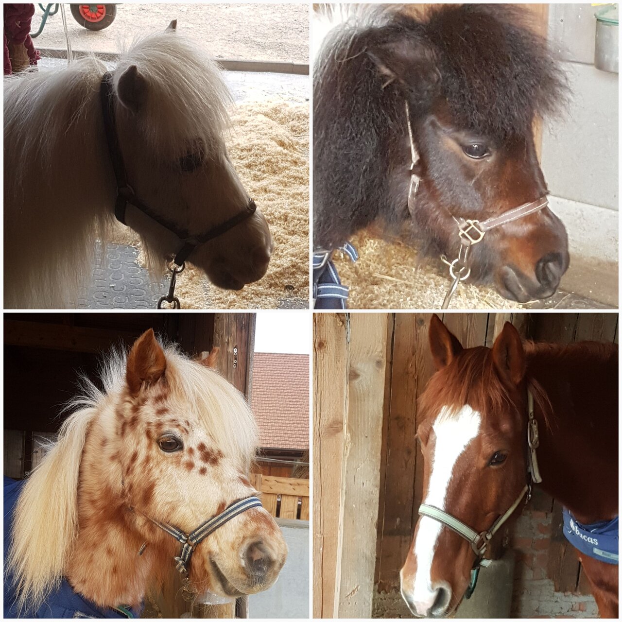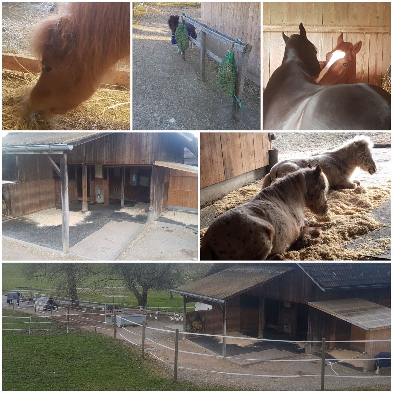 Es leben 5 Minihorses da ( 1 Wallach und 4 Stuten) und einen grossen schwarzen, sehr sozialen Kutschwallach, welche die Kleinen über alles liebt in unserer WG.
